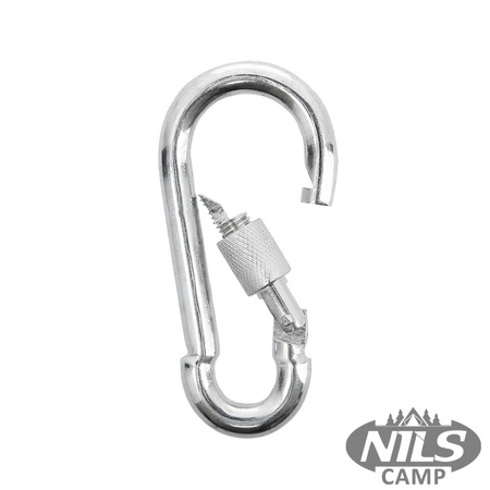 NB5042 NILS CAMP to stalowy karabińczyk, z mechanizmem zabezpieczająco skrętnym. Jego zamknięcie, to nie tylko zatrzask, ale i zakrętka. Stosunek jego wagi, do wytrzymałości jest bardzo korzystny. Produkt waży zaledwie 9 g, a jego maksymalne obciążenie to 500 kg. Bardzo łatwo się go używa. Najczęściej stosowany do łączenia lin.