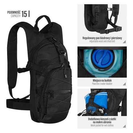 NC1732 Crab marki Nils Camp to lekki, taktyczny plecak o pojemności 15l, który został stworzony dla wszystkich miłośników wypraw w góry jak i do lasu. Model Crab wykonany jest z wysokiej jakości materiałów, posiada liczne, praktyczne rozwiązania, które podniosą komfort i jakość użytkowania. Wysoka jakość wykonania Materiał: Plecak wykonany jest z wytrzymałego materiału oxford oraz z lekkiego nylonu, dzięki czemu jest odporny na liczne otarcia i uszkodzenia mechaniczne Wodoodporność: Crab wykonany jest z materiału o wodoodporności 1000mm, dlatego wędrówki w deszczowe dni nie będą stanowić żadnej przeszkody Funkcjonalność Komora główna z miejscem na bukłak: Komora główna na suwak posiada dodatkową przegrodę oraz specjalne uchwyty służące do montażu bukłaka. Kieszenie: Oprócz komory głównej model Crab posiada pięć dodatkowych kieszeni: - Przednia kieszeń na klips - Przednia kieszeń ściągana paskami kompresyjnymi - Dwie przednie kieszenie na suwak - Gumka na froncie plecaka, służąca do mocowania dodatkowego sprzętu Regulowane paski: Plecak wyposażony jest w pas biodrowy oraz piersiowy, który odciąża nasz kręgosłup, co znacznie poprawia komfort użytkowania i ogranicza wystąpienie dolegliwości w plecach. Dodatkowo model Crab posiada boczne pasy kompresyjne, dzięki którym możemy zmniejszyć lub zwiększyć pojemność plecaka Uchwyt górny: Parciany uchwyt do przenoszenia plecaka w dłoni Specyfikacja: Materiał: 800D Oxford, 210T Nylon Pojemność: 15l Wodoodporność: 1000 mm   Wymiary: Wysokość: 42 cm Szerokość: 21 cm Głębokość: 14 cm Ilość kieszeni z przodu: 5 Regulowany pas biodrowy: 42 cm – 90 cm Regulowany pas piersiowy: 12 cm – 30 cm Waga produktu: 600 g Uwagi: Nie przeznaczona do użytku komercyjnego 24 miesięczna gwarancja Importer: Abisal Sp. z o.o.| Polska | 41-807 Zabrze | ul. Pyskowicka 17 | e-mail: abisal@abisal.pl Abisal Sp. z o.o. deklaruje, iż produkty sprzedawane przez firmę są bezpieczne i spełniają wymagania zawarte w Ustawie o ogólnym bezpieczeństwie produktów z dnia 12 grudnia 2003r. (Dz.U. z dnia 31 grudnia 2003r.)