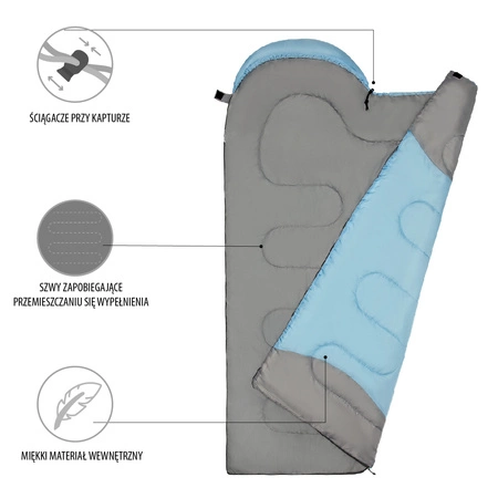 Śpiwór, zapakowany jest w praktyczny i poręczny pokrowiec, który dodatkowo posiada pasy kompresujące. Dzięki temu, możemy regulować jego wielkość.
