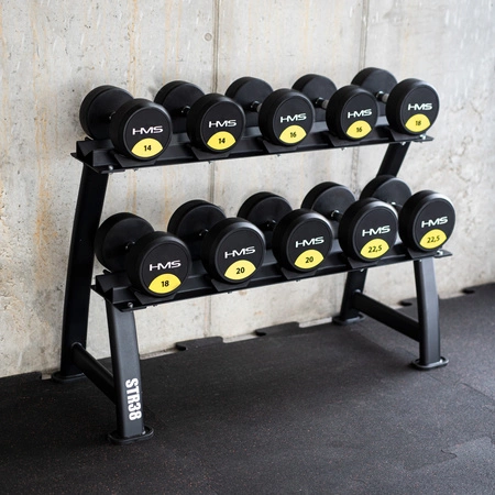 STR38 oferuje dwa poziomy przechowywania, które mieszczą do 10 par hantli. Dzięki lekko pochylonej powierzchni, chwytanie hantli jest wygodne i nie wymaga nadmiernego prostowania nadgarstków, co redukuje obciążenie stawów i zwiększa komfort użytkowania.