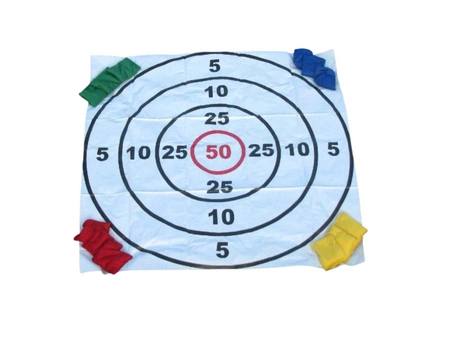 Gra zręcznościowa tarcza leżąca z woreczkami, przeznaczona dla czterech graczy. Celem gry jest zdobycie największej ilości punktów w trzech rzutach. W skład zestawu wchodzi: 1) Tarcza - mata składana wykonana z ceraty PCV o wymiarach 108 x 108 cm 2) Woreczki gimnastyczne wykonane z tkaniny poliestrowej wypełnione granulatem polietylenowym w czterech kolorach w ilości 12szt. 3) Worek stylonowy do przechowywania złożonego zestawu. Dobra zabawa umożliwiająca doskonalenie celności, koordynacji ruchowej, liczenia - nauka przez zabawę. Idealnie sprawdzi się w przedszkolu, szkole, na imprezach integracyjnych.