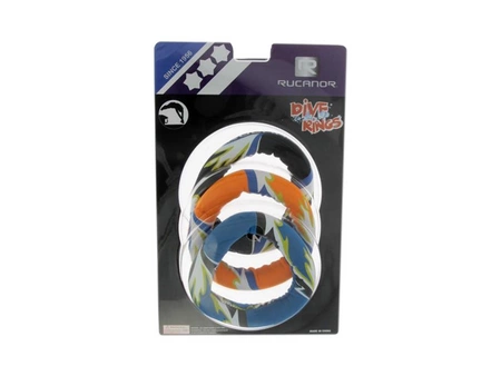 Zabawki do nauki nurkowania Rucanor Ringo 3 sztuki Zestaw zabawek do nauki nurkowania renomowanej firmy produkującej sprzęt sportowo-rekreacyjny Rucanor składa z trzech wypełnionych piaskiem neoprenowych pierścieni. Zabawki są miękkie, wodoodporne i niezwykle wytrzymałe. Podczas zabawy w basenie powoli opadają na dno, a ich atrakcyjna kolorystyka i odpowiednie wykonanie pozwala naszemu dziecku spokojnie je złapać podczas nauki nurkowania.