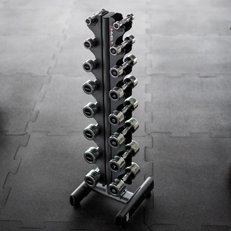 Dołączony do zestawu stojak STR36 to solidna konstrukcja zaprojektowana z myślą o przechowywaniu hantli w sposób wygodny i estetyczny. Dzięki kompaktowym wymiarom idealnie sprawdzi się w niewielkich przestrzeniach, a jego pionowa budowa umożliwia łatwy dostęp do każdej pary hantli. Stojak ma maksymalną nośność 75 kg, co pozwala na bezpieczne przechowywanie całego zestawu. STR36 to doskonały wybór dla tych, którzy cenią sobie porządek i funkcjonalność w swojej przestrzeni treningowej.
